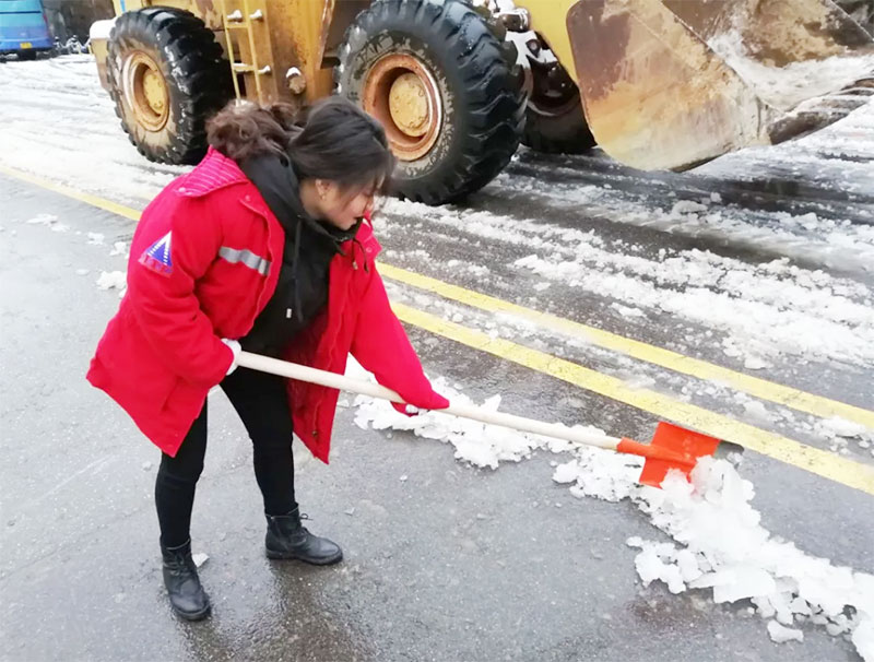 有想法就付諸于行動,簡短交流后,員工們開始有效的分工安排,開裝載機、拿鐵鍬、用掃帚、撒工業(yè)鹽、保障物資等,默契合作。